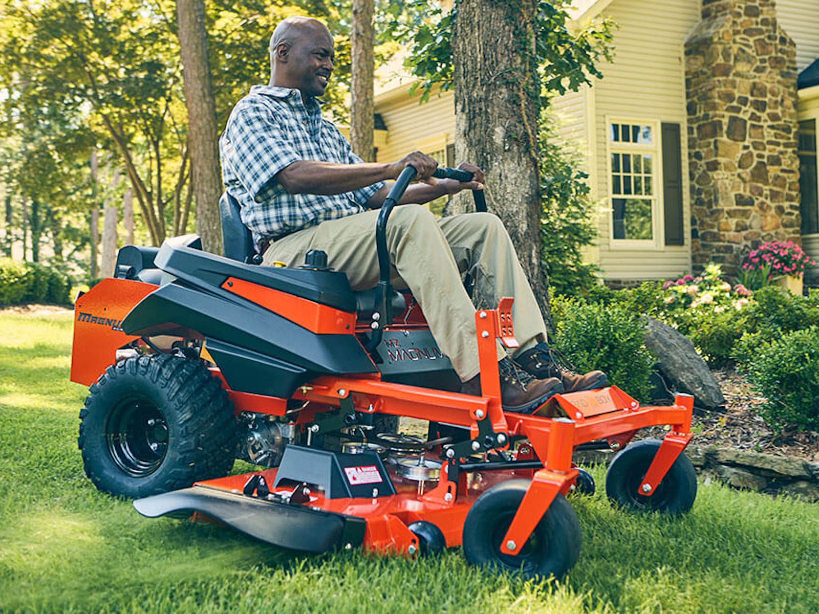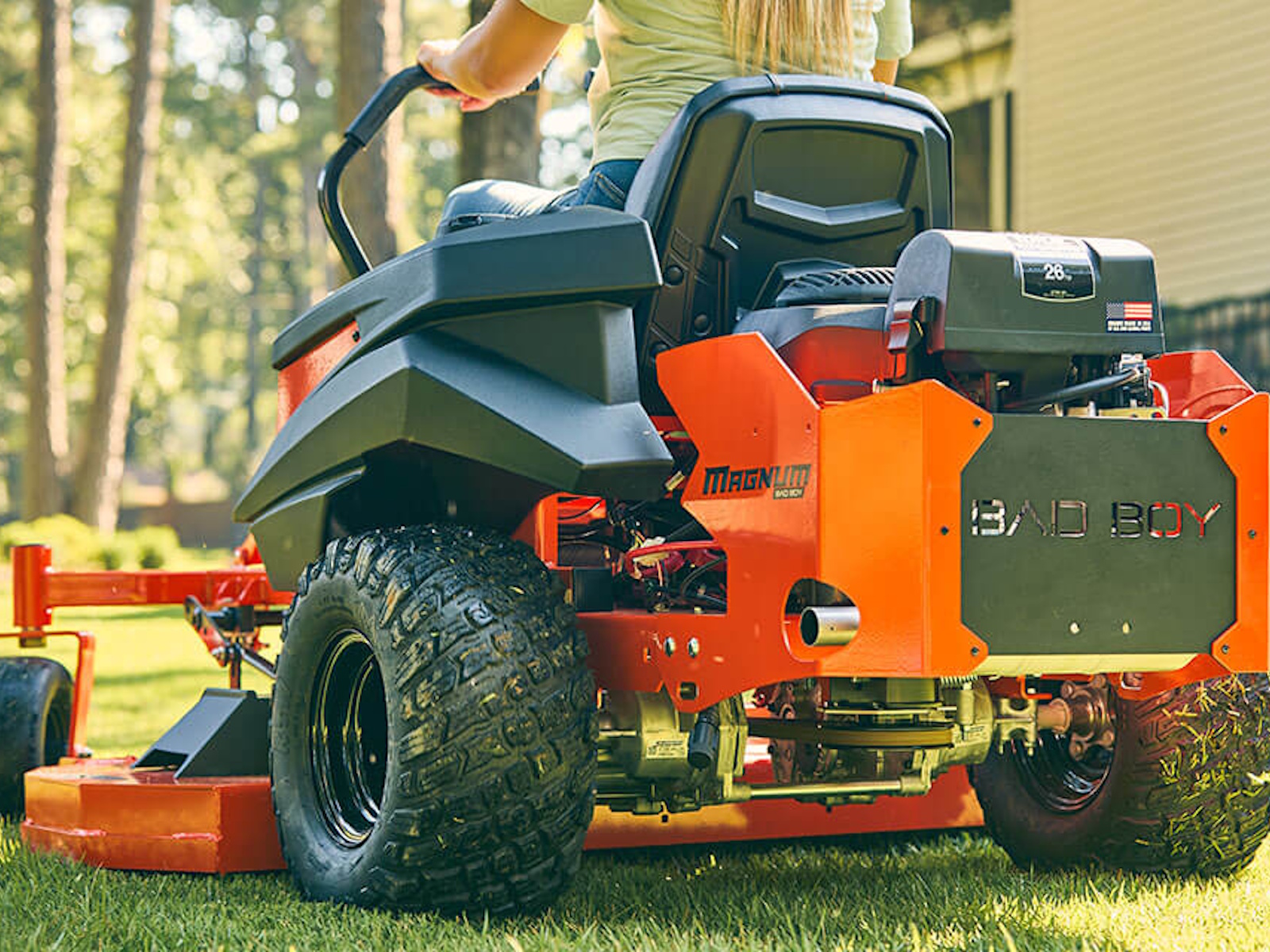 The MZ Magnum Zero-Turn Riding Lawn Mower is built right here in the USA, with all the toughness you'd expect from Bad Boy. That's because it's manufactured alongside its larger commercial cousins from quality Bad Boy steel at our Arkansas headquarters. And what's good for the big dogs is just as good for this smaller, residential mower. You get the same professional quality, the same zero-turn efficiency, and the same comfortable ride at an even more affordable price. And you don't have to sacrifice power or performance to do it.
