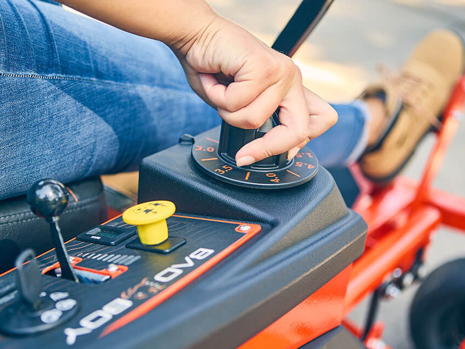 - Lift the deck with the foot pedal and dial up the perfect height for the turf you're mowing. The Deck Dial, electric blade start, throttle and engine start are all conveniently located in one place and right at your fingertips.