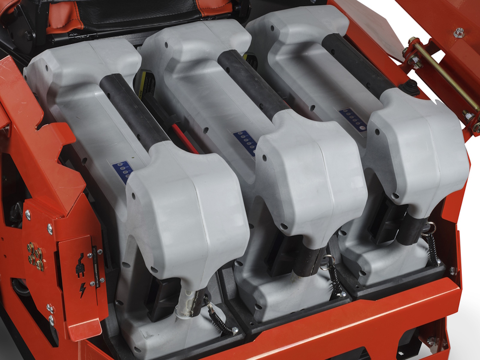 Use one, two, or three batteries in the ZT5E: each is 2.5 kWh, allowing for up to 7.5 kWh. The power for mowing and self-propulsion is the same regardless of how many batteries are installed—the difference is in runtime. Recharge overnight in the mower.