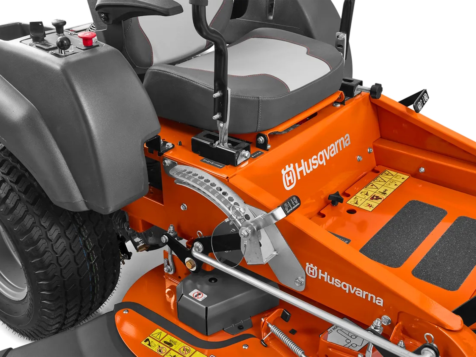 - Quickly adjust the cutting height with the ergonomic, pedal-assisted cutting deck lift system