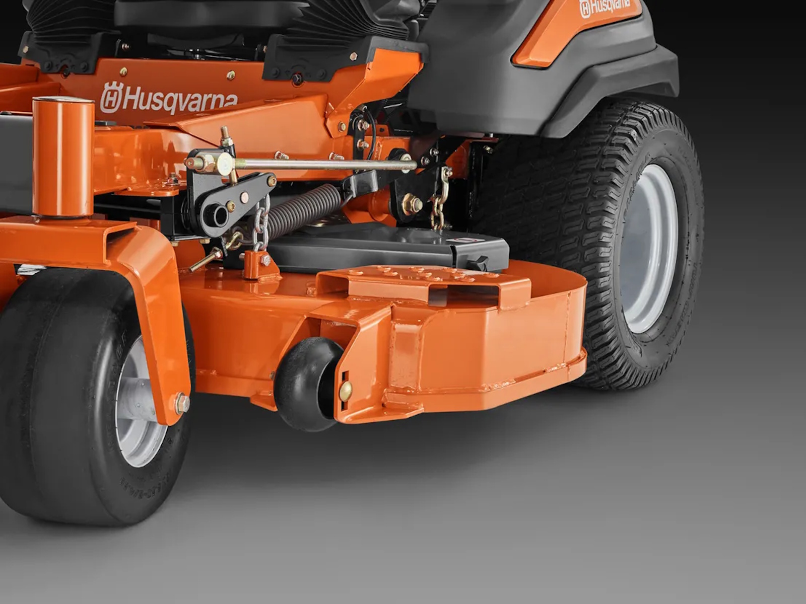 - The deck lift system is spring assisted and allows convenient hand free operation. A simple locking pin adjusts cut height.