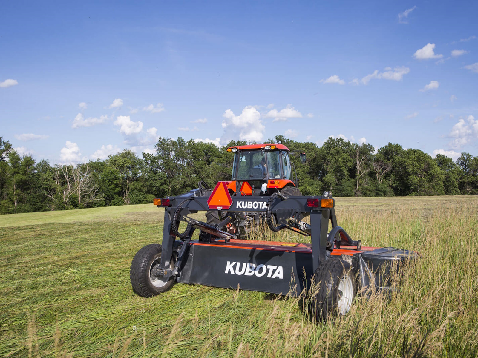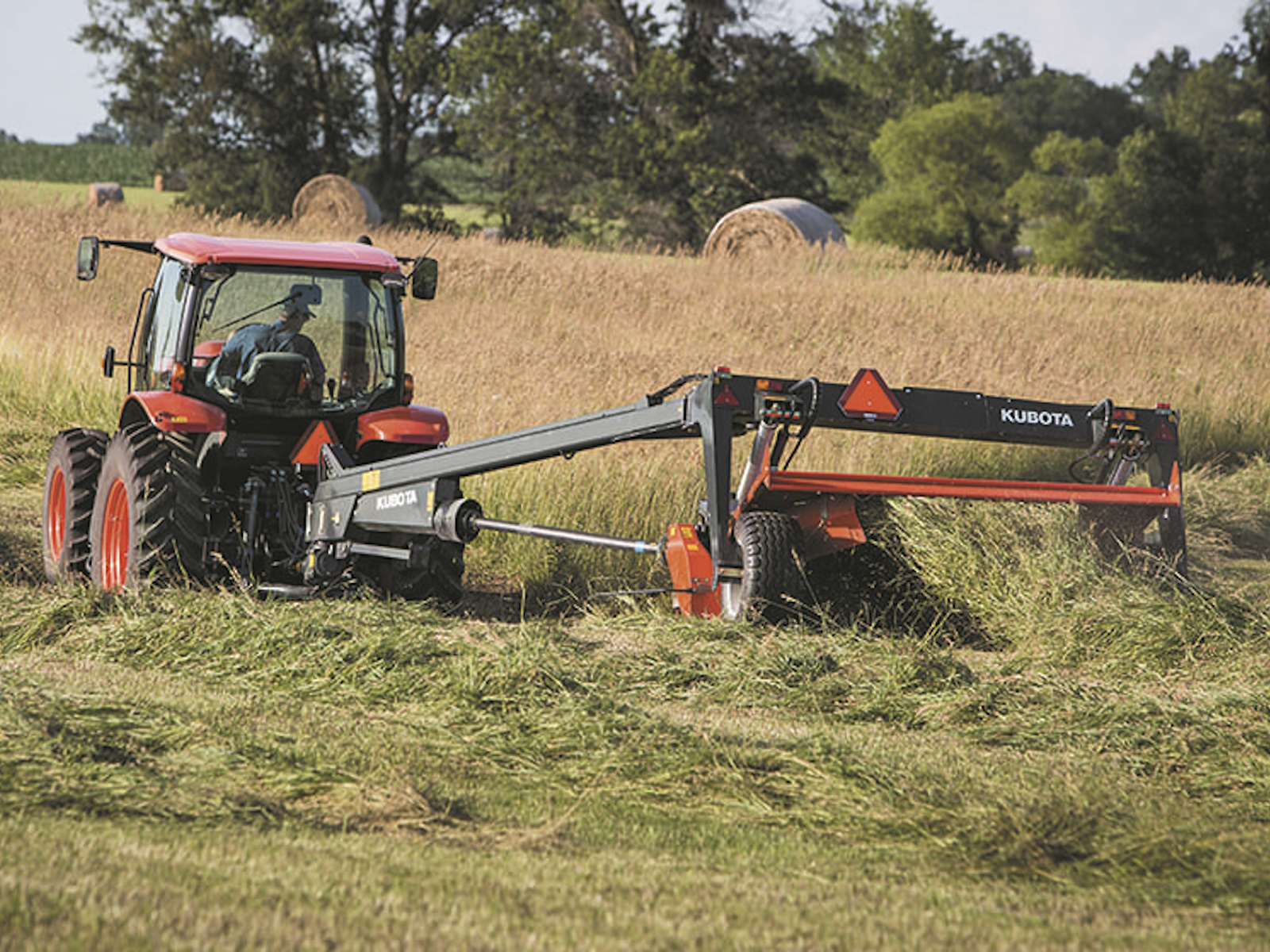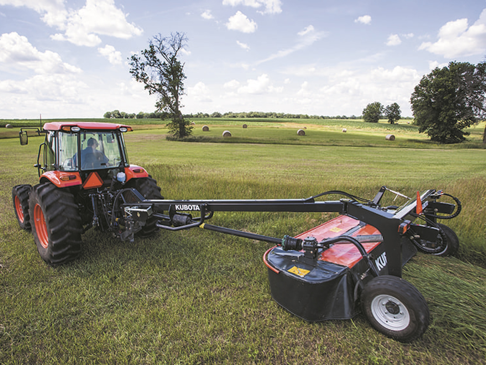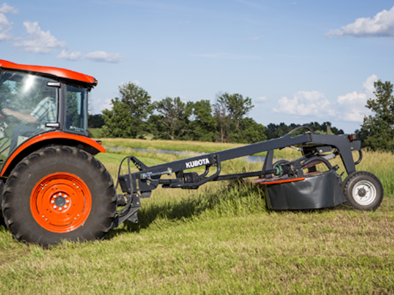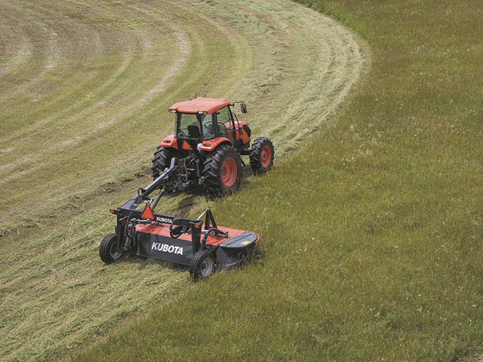 • The Kubota DM5032, DM5040, and DM5028 have an exceptional ability to adapt to field conditions. The active suspension ensures even pressure across the entire cutterbar while in rough conditions. With 13.8" of upward suspension and 9.3" of downward adaption, these machines ensure that the cutting discs are always positioned close to the ground, ensuring outstanding cutting quality and trouble-free mowing.