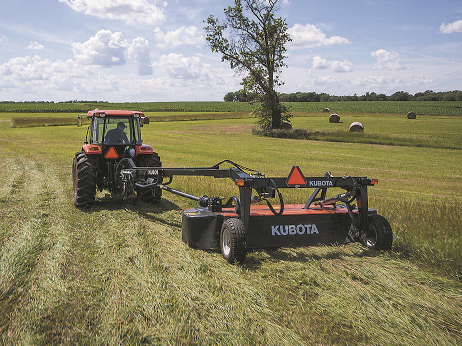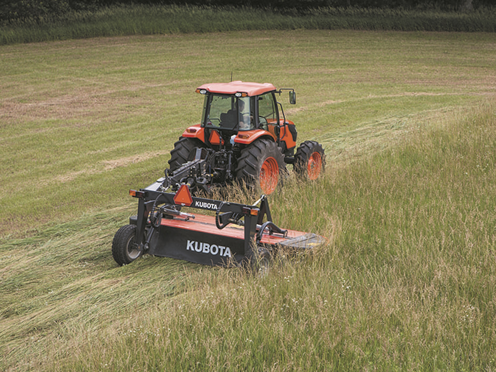 • With three blades per disc, Kubota mowers are constantly cutting. This means a third less load per blade, an even load on the drive and smoother power usage – which produces an even, cleanly cut stubble. Each steel blade is precisely angled to immediately discharge the cut crop upwards by both air flow and mechanical action.