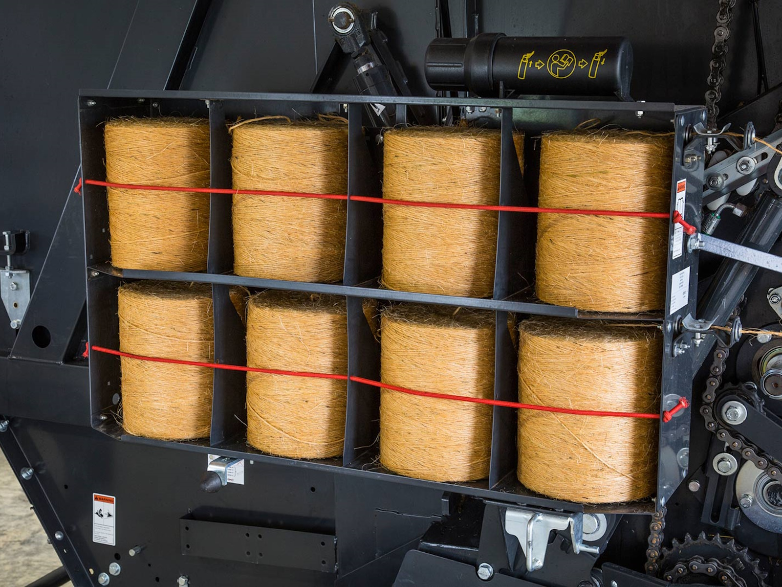 - Automatic twine tying with the fast acting double tube system means simultaneous binding of both edges of the bale, keeping binding time to a minimum. Over crossing of twines in the center of the bale provides no loose ends at the end of the binding cycle.