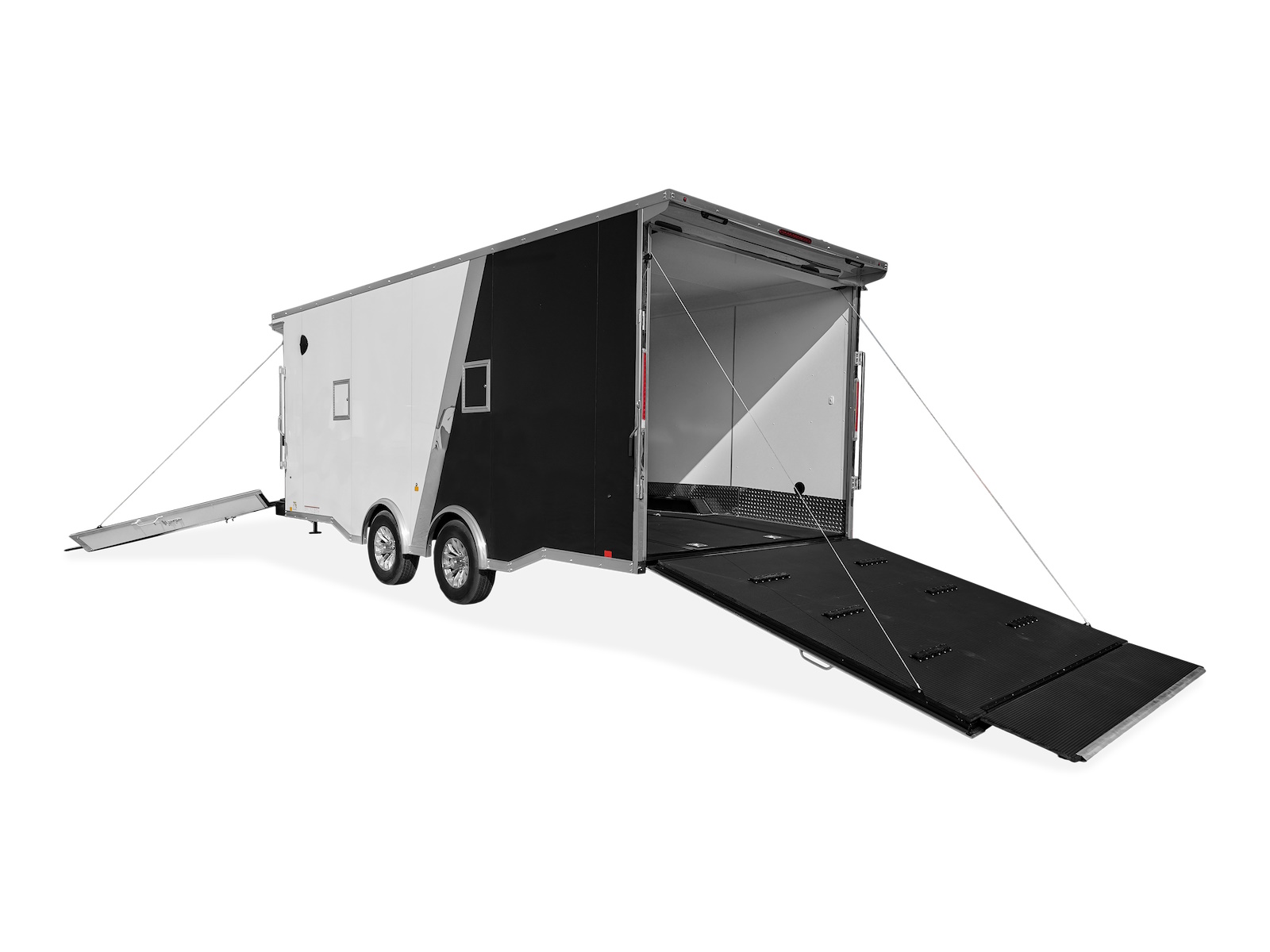 The interior of the Motorsport trailers features 9mm white vinyl walls, vinyl H-molding on the walls, and a .045″ ATP kickplate. The flooring is made of 3/4″ Nudo flooring, which is used for the trailer, ramp, and extension. The trailers have automotive undercoating and a white vinyl ceiling with white aluminum coves. They also have (4) 5K D-rings and Xtreme slide track with (8) D-rings for securing cargo. The trailers are equipped with a 7-way electric plug and a breakaway battery with a switch. They have bullet LED marker and clearance lights, as well as slimline LED tail lights with an integrated backup light. The trailers also have loading lights under the spoiler and over the front ramp, both with switches. Additionally, they have (2) 11in deluxe LED dome lights with a switch. The exterior of the trailers features a 0.030 aluminum exterior, brite aluminum rear hoop, and a white, black, silver, pewter, or charcoal screwless exterior. They also have a 24″ tall straight ATP stone guard, brite nose cap, and 2.5″ top trim and 3″ bottom trim. The trailers have a seamless aluminum roof and a 9″ deep rear flare with a brite aluminum ceiling. They also have an interior recessed step, cast aluminum door holdback, and a rear ramp door with spring assist. The ramp door has a capacity of 4000 lbs and is equipped with traction bars. The trailers also have a wrap-around V-nose ramp door and a 14″ x 14″ fuel door. They are equipped with sidewall vents for ventilation.
