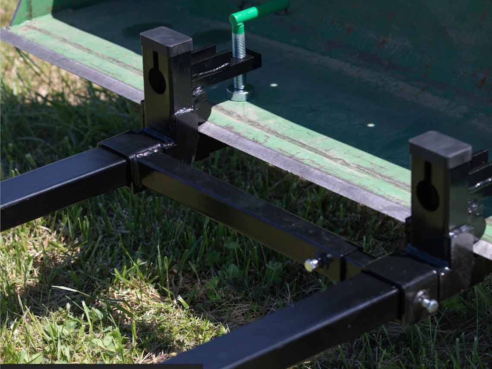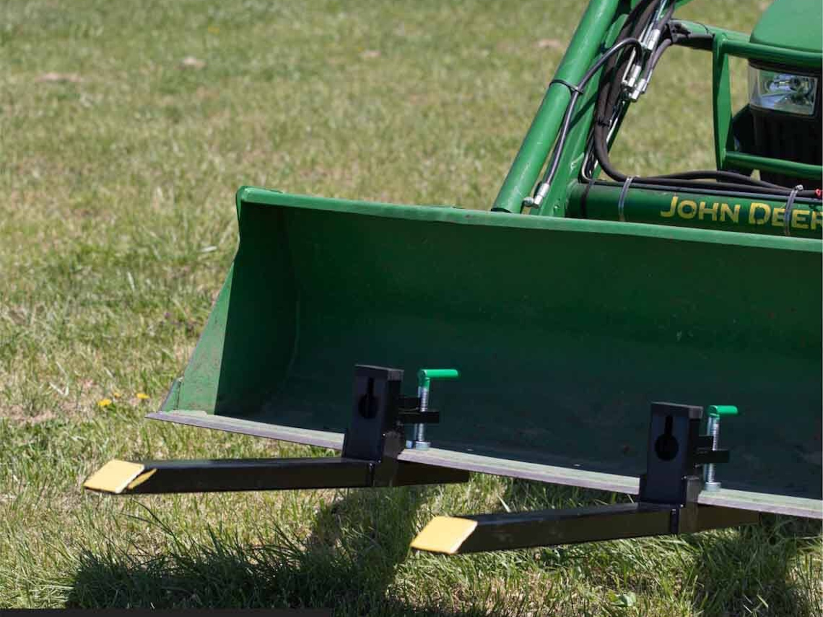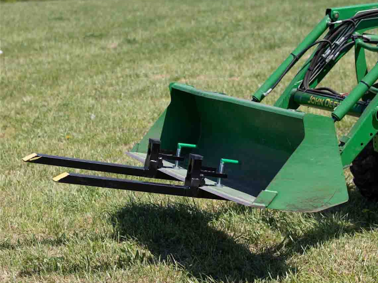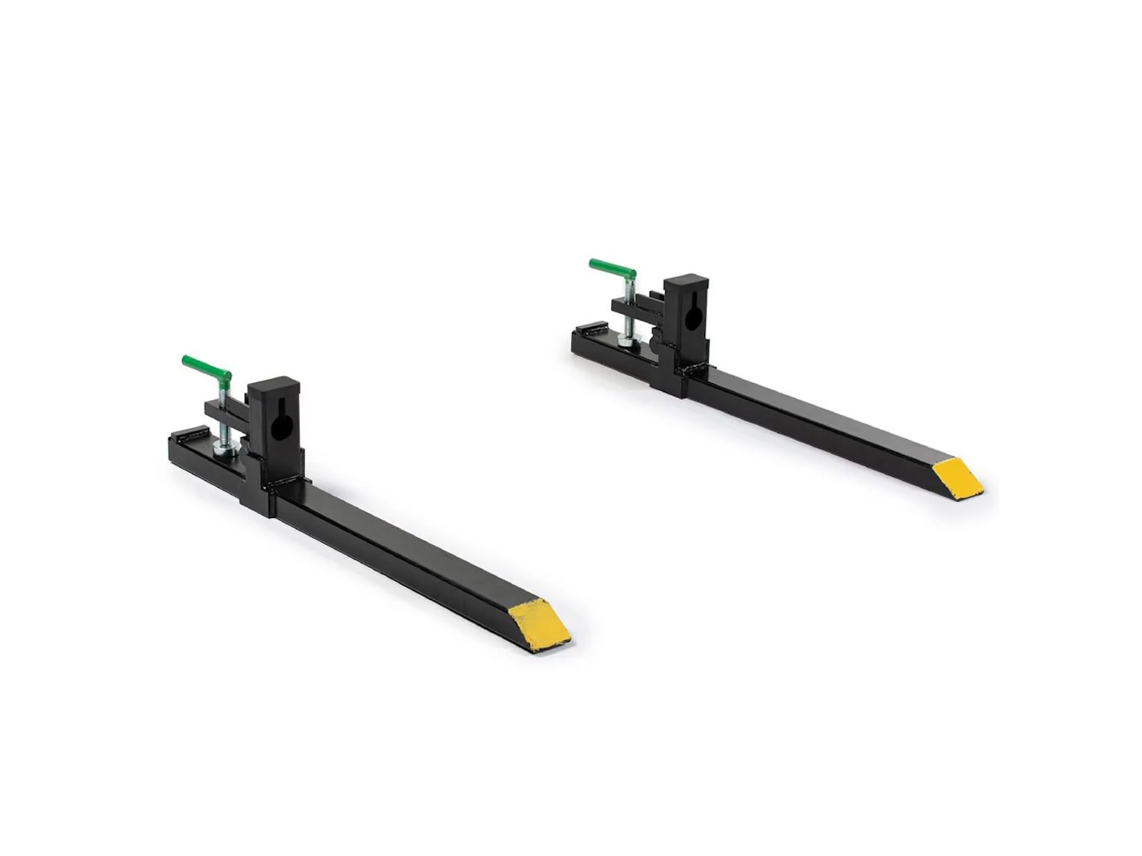 The Light-Duty Clamp-On Pallet Fork Blades are designed to easily install on the front of your skid steer or tractor loader bucket. This universal mount slides over the bucket cutting edge and utilizes the underside for leverage. The durable pallet fork is constructed of an all-steel tubular structure with secure clamps and pucks, rollback protection, and chain holes for secure heavy lifting of up to 1,500 LB. With the clamp-on puck secured, the blade will slide onto buckets up to 1.5" thick and 2" without the puck. These Clamp-On Pallet Forks come with an adjustable stabilizer bar, so you do not have to worry about your forks spreading apart while you use them. The bars adjust from 19.5" to 36" by turning the adjustment knob until it is at your desired distance. The versatility of our pallet forks is endless; use this attachment on the farm, workplace, or homestead to haul lumber, hay bales, crates, and debris.
